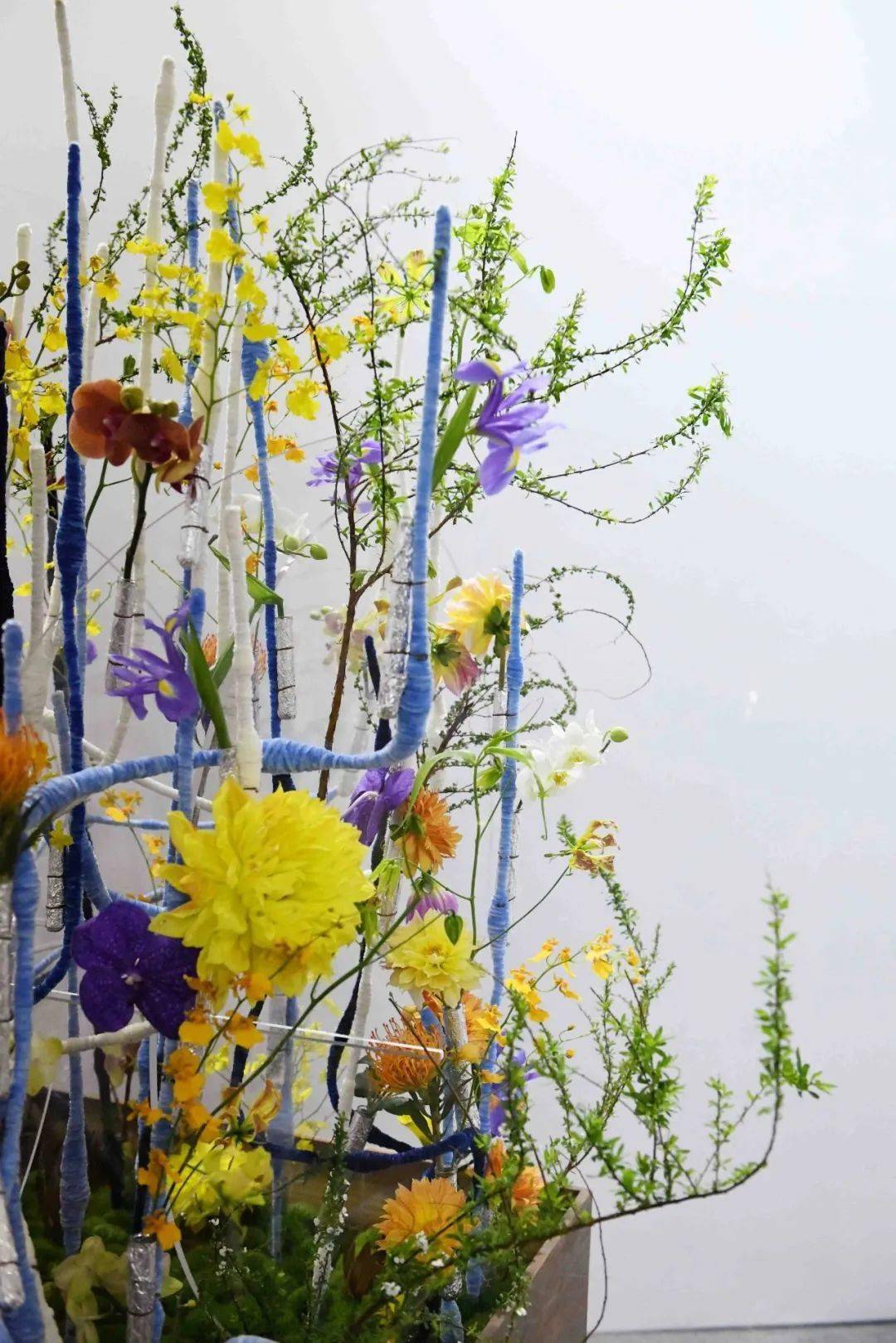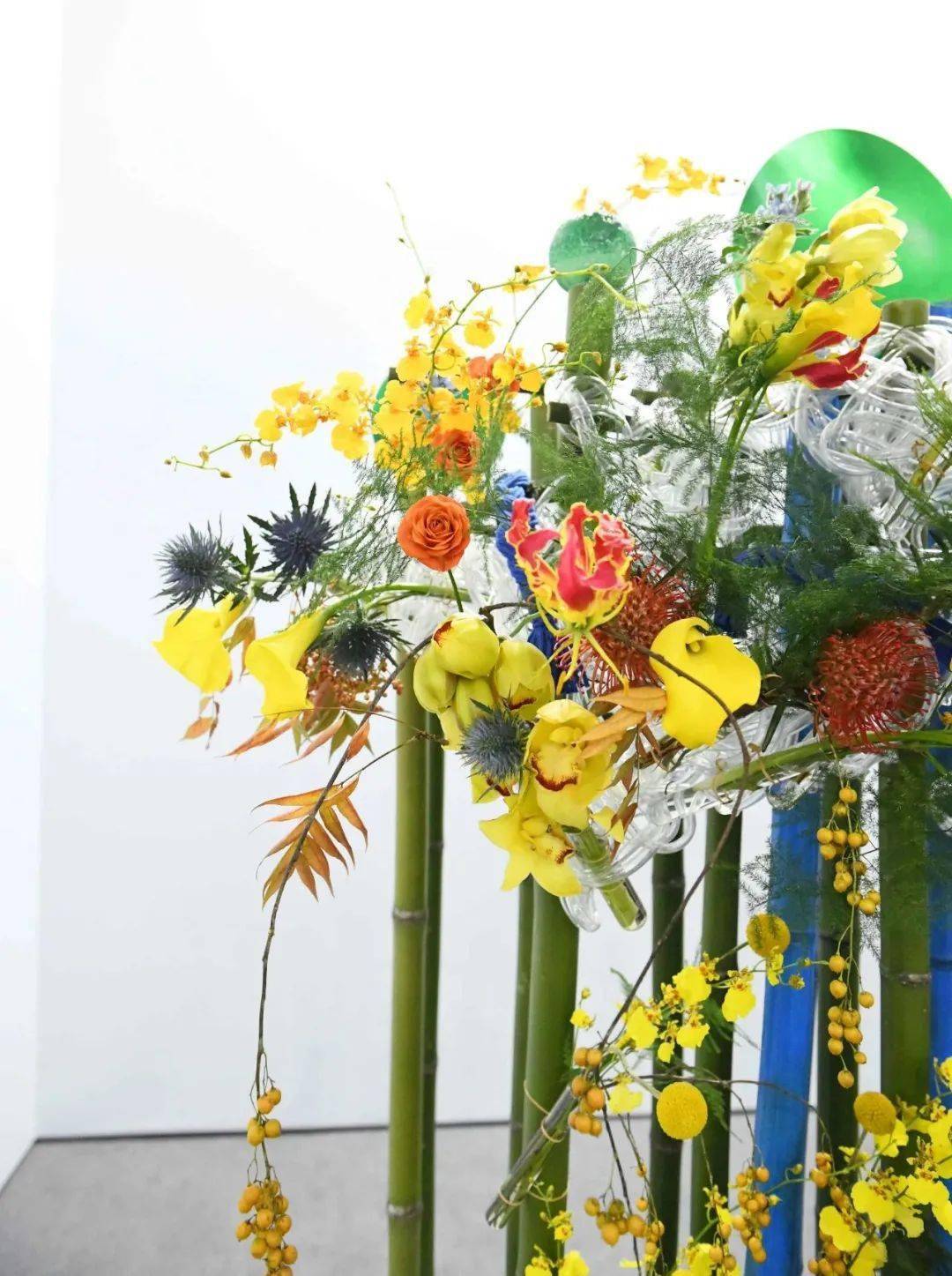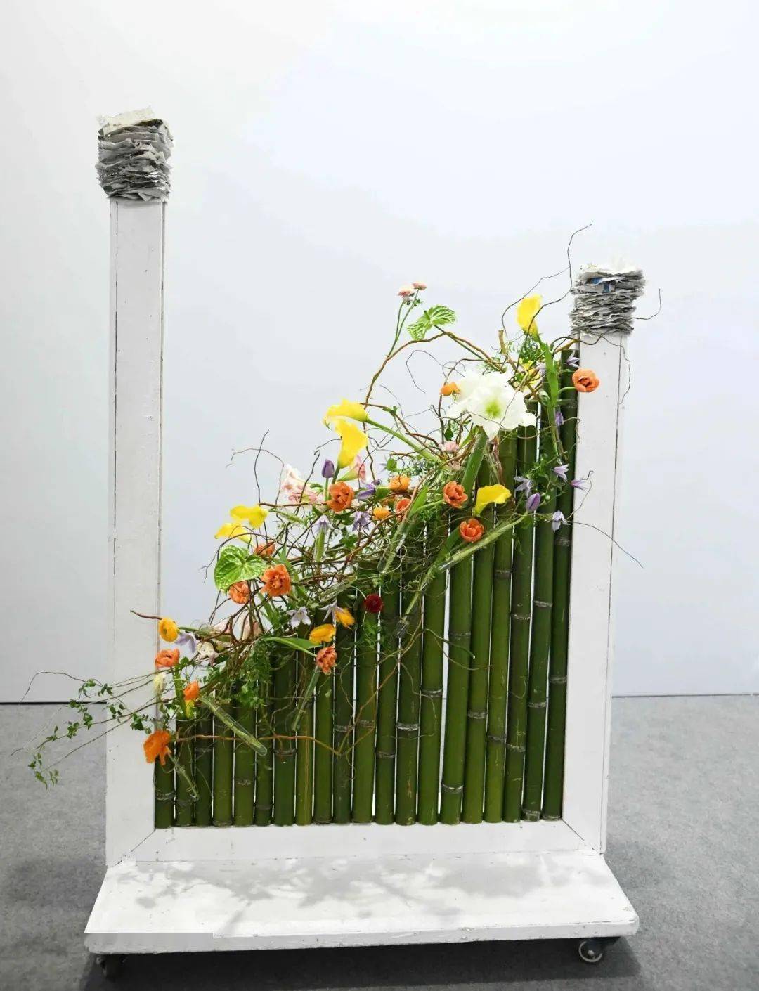 作品主要以竹子为基材,它们一根根并列排放,创造动态感和流动感。选用蝴蝶兰、掌、唐棉、龙柳、虞美人、郁金香、针垫等花材,竹子与鲜花结合,展现大自然的生生不息与万物生长的奇迹,辅助材料用到报纸,突出作品与现代社会的联系。