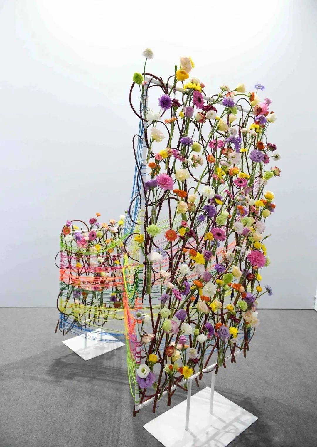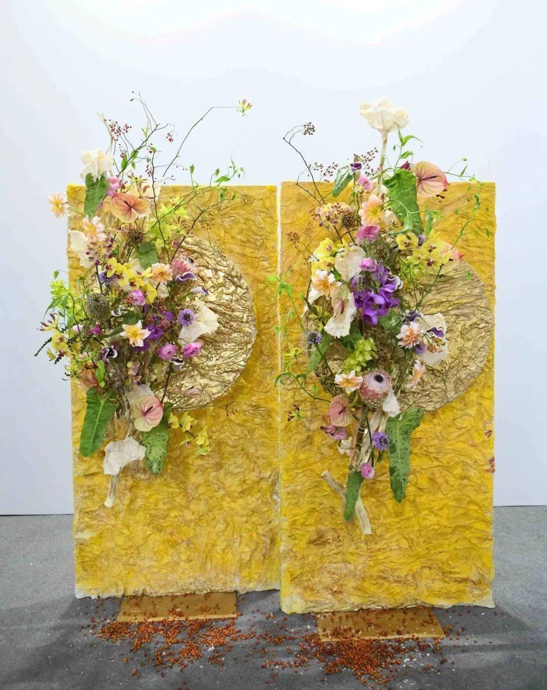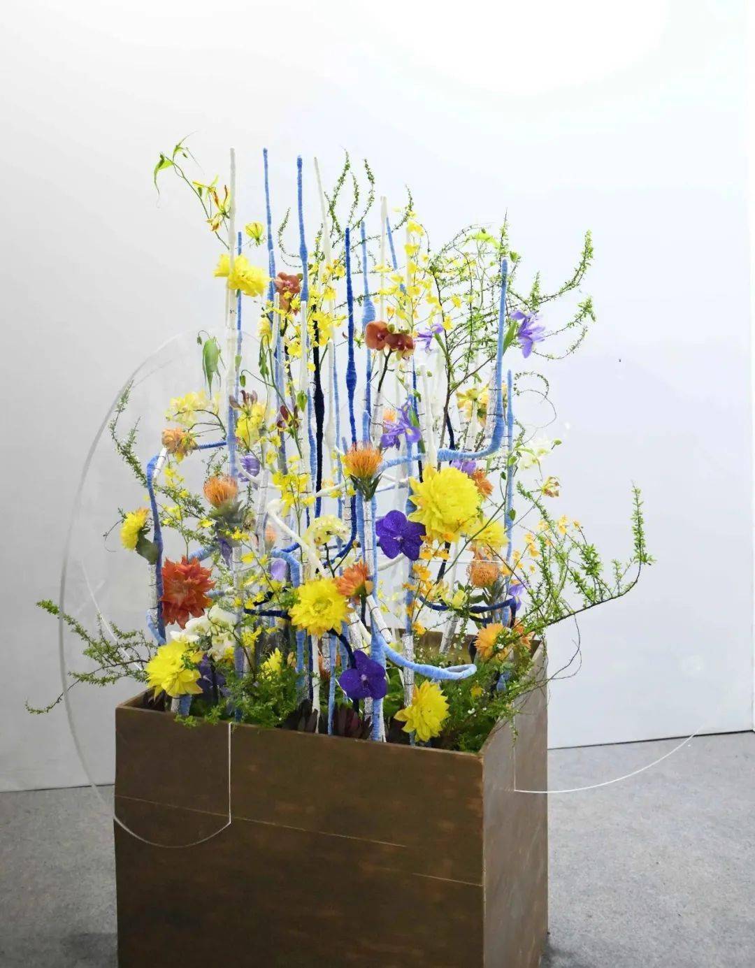作品主要以竹子为基材,它们一根根并列排放,创造动态感和流动感。选用蝴蝶兰、掌、唐棉、龙柳、虞美人、郁金香、针垫等花材,竹子与鲜花结合,展现大自然的生生不息与万物生长的奇迹,辅助材料用到报纸,突出作品与现代社会的联系。