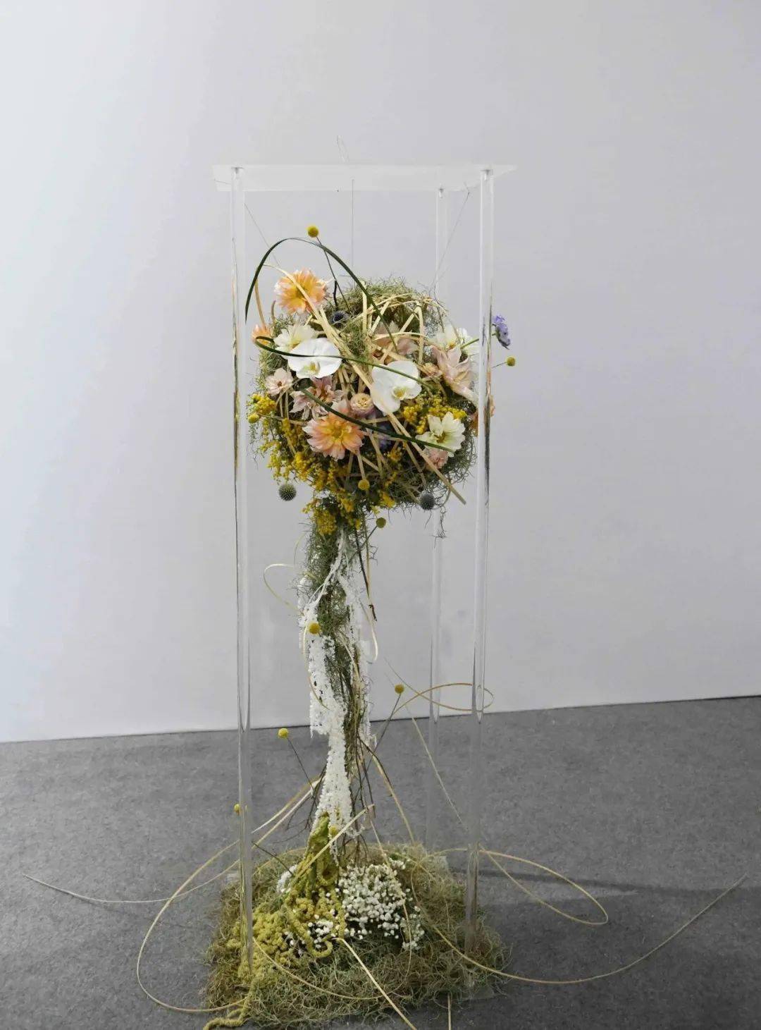 作品使用木制结构构成主体架构,配合鲜花苔藓点缀,整体造型从地面成向上趋势生长延伸,设计理念为积极向上,不断突破,向阳而生,不断追寻,自由绽放。