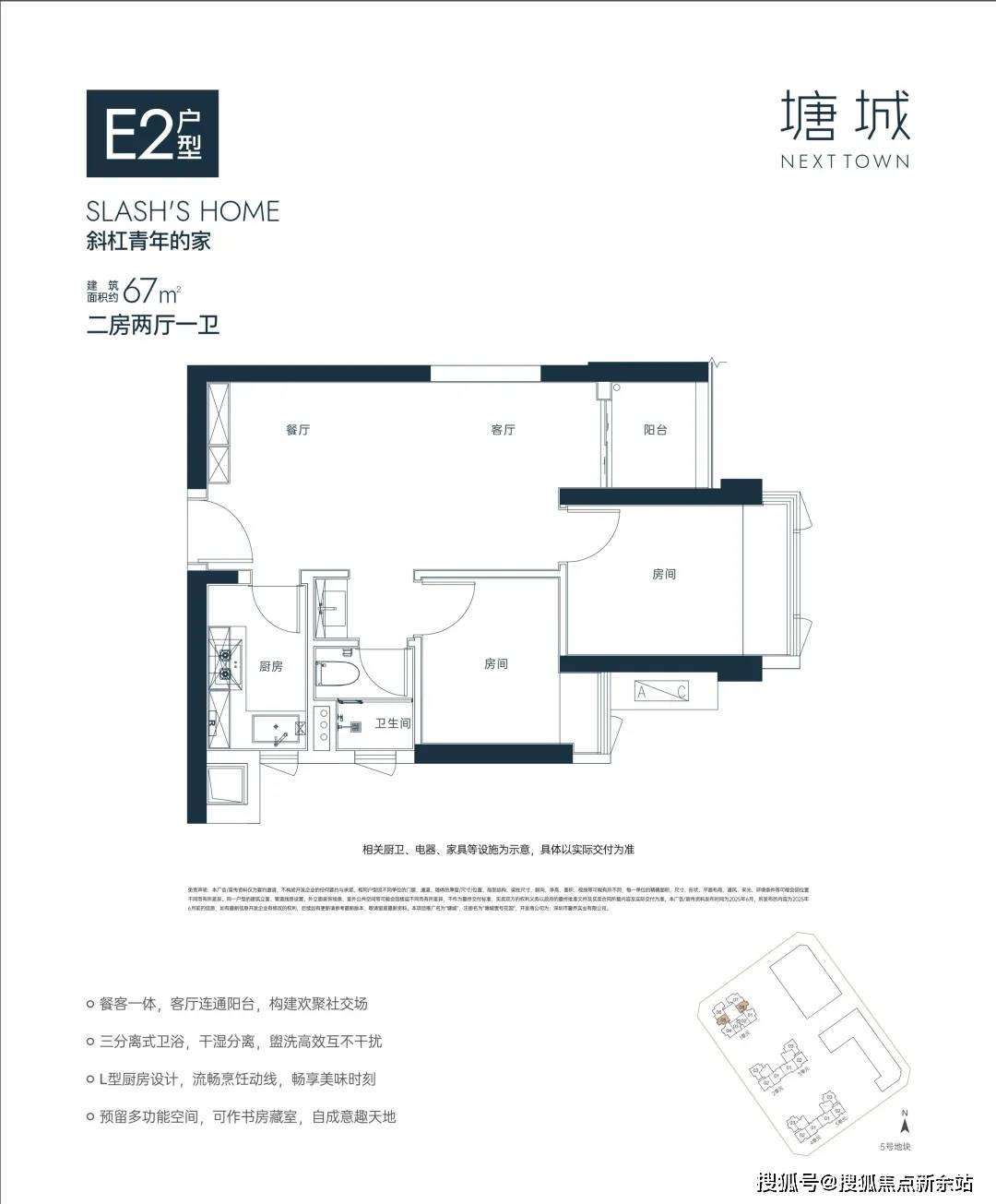 “10.7 m纵深紧凑南向三房”,10.7 m纵深餐客一体,通风采光极佳