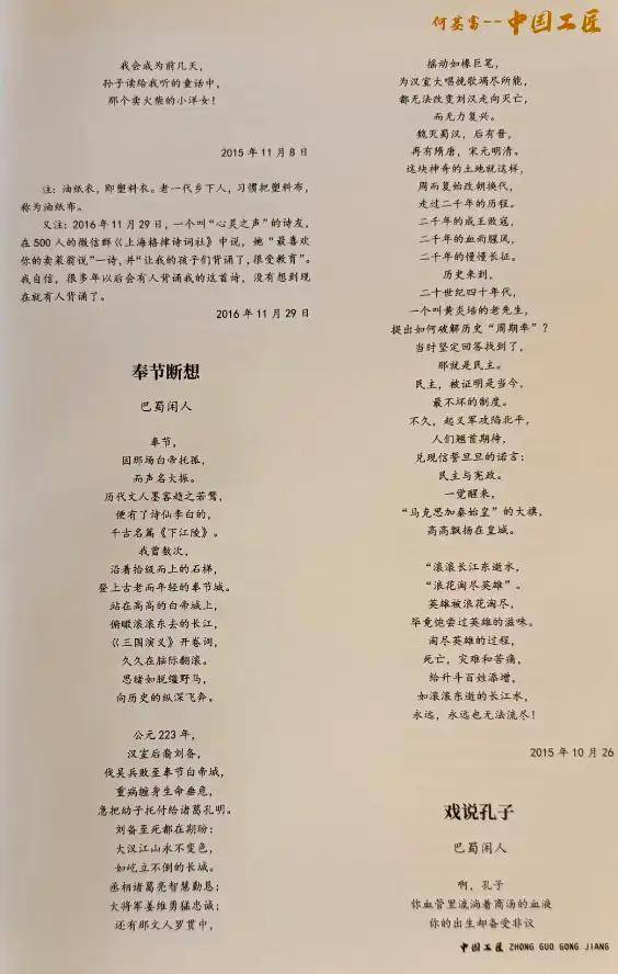 著名诗人何基富的经典代表诗歌《卖菜翁说》、《奉节断想》、《戏说孔子》、《啊,祖先》,以及《父亲节祭父亲》、《母亲拔牙,肉跳心惊》、《反思在夕阳下奔涌》等16首作品,包括2首旧体诗,入编《大国工匠》一书,从第12页到21页,满排10页,编排在第一位,已于近日出版。