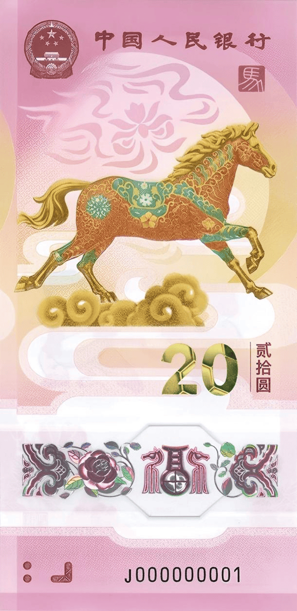 双色铜合金纪念币正面图案底纹衬以团花图案,背面图案为中国传统剪纸艺术与装饰年画元素相结合的马形象,衬以花灯和萱草图案,币面左侧刊“丙午”字样;纪念钞正面主景为马的造型图案,带有篆书“马”字印章,背面主景为儿童欢庆锣鼓图案,辅以蒙古包装饰图案。金银纪念币正面图案均为中国传统吉祥纹饰组合图案,一克圆形金质纪念币背面图案为“福”字、荷包组合设计,八克菱形银质纪念币背面图案为“福”字、舞鱼灯场景组合设计。从古典纹样的复刻传承到当代设计的创新表达,从金属的精工细作到民俗元素的巧妙植入,这套纪念币既是对马文化“奋进、忠诚”精神的诠释,也是当代设计人探索本土文化与国际审美接轨的实践,为大众献上一份兼具美学价值与文化底蕴的新春厚礼。