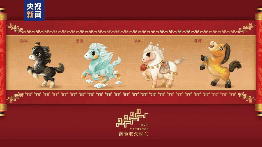 每年春晚,吉祥物都是新春生肖设计的“重头戏”。2026年春节联欢晚会以“骐骥驰骋 势不可挡”为主题,发布“骐骐”“骥骥”“驰驰”“骋骋”四匹骏马吉祥物,打破以往单一吉祥物的传统,以群像设计传递团结奋进的时代精神,其背后的美术来源与视觉表达,彰显出传统美术与当代设计的融合。吉祥物的设计灵感来源于中国传统马文化中的美术形象,并将流云纹、山云纹等千年纹样“穿”上身,让每一匹骏马都承载着厚重的文化底蕴,充盈着生生不息的历史美感和万象更新的时代气象,饱含美好寓意。