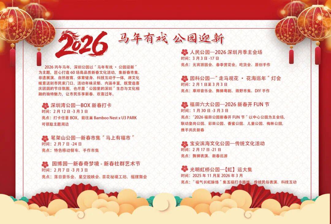 活动以“公园+民俗+潮玩+非遗”为核心,联动深圳中心公园(主会场)、香蜜公园、皇岗公园、深圳市儿童乐园、彩田公园、梅林公园,打造贯穿整个春节假期的沉浸式文旅盛宴,诚邀广大市民游客打卡体验,共赴热闹非凡的新春之约。
