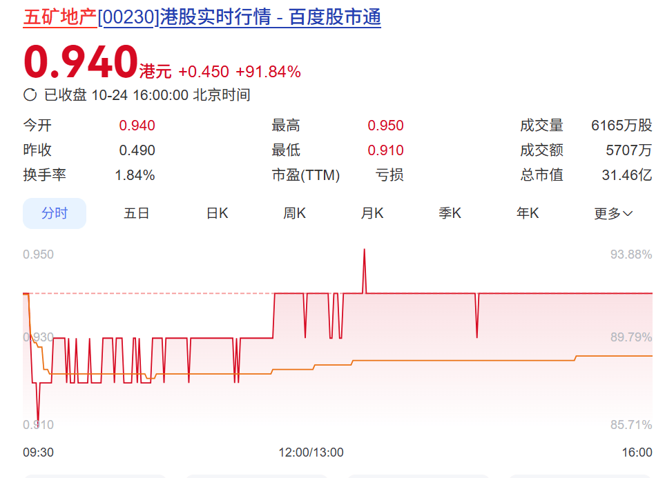由于停牌前五矿地产的股价为0.35元/股,而此次私有化注销价为1元/股。因此,受此消息影响,2025年10月24日五矿地产复牌后股价大涨90%以上,截止收盘股价为0.94元/股,上涨91.84%,市值为31.46亿元。