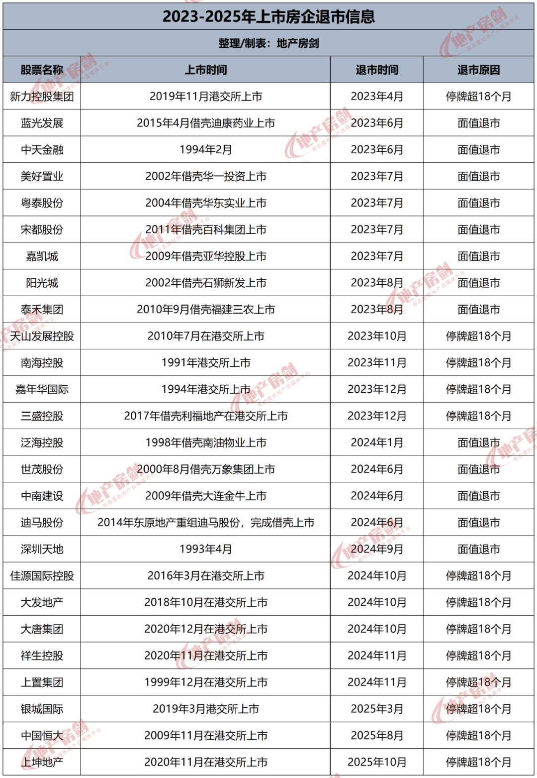 从2023年4月新力控股集团退市开始,截止2025年10月24日,已经有25家上市房企退市,其中A股13家、港股13家,各占一半。