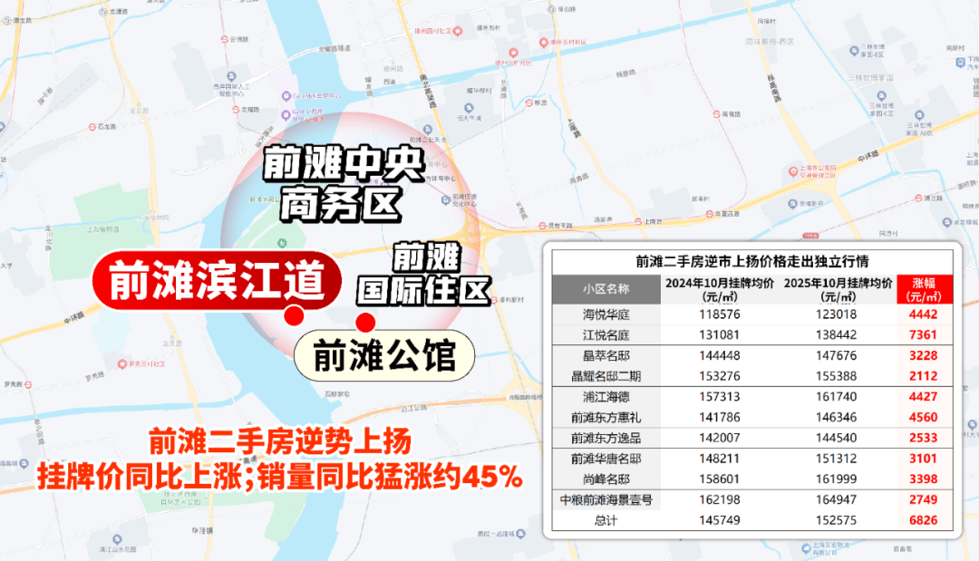 而前滩滨江超级完整体,在2025年上海楼市中交出了惊艳成绩单——当约98%的板块挂牌价同比下降时,前滩逆势“量价齐升”,走出独立行情。
