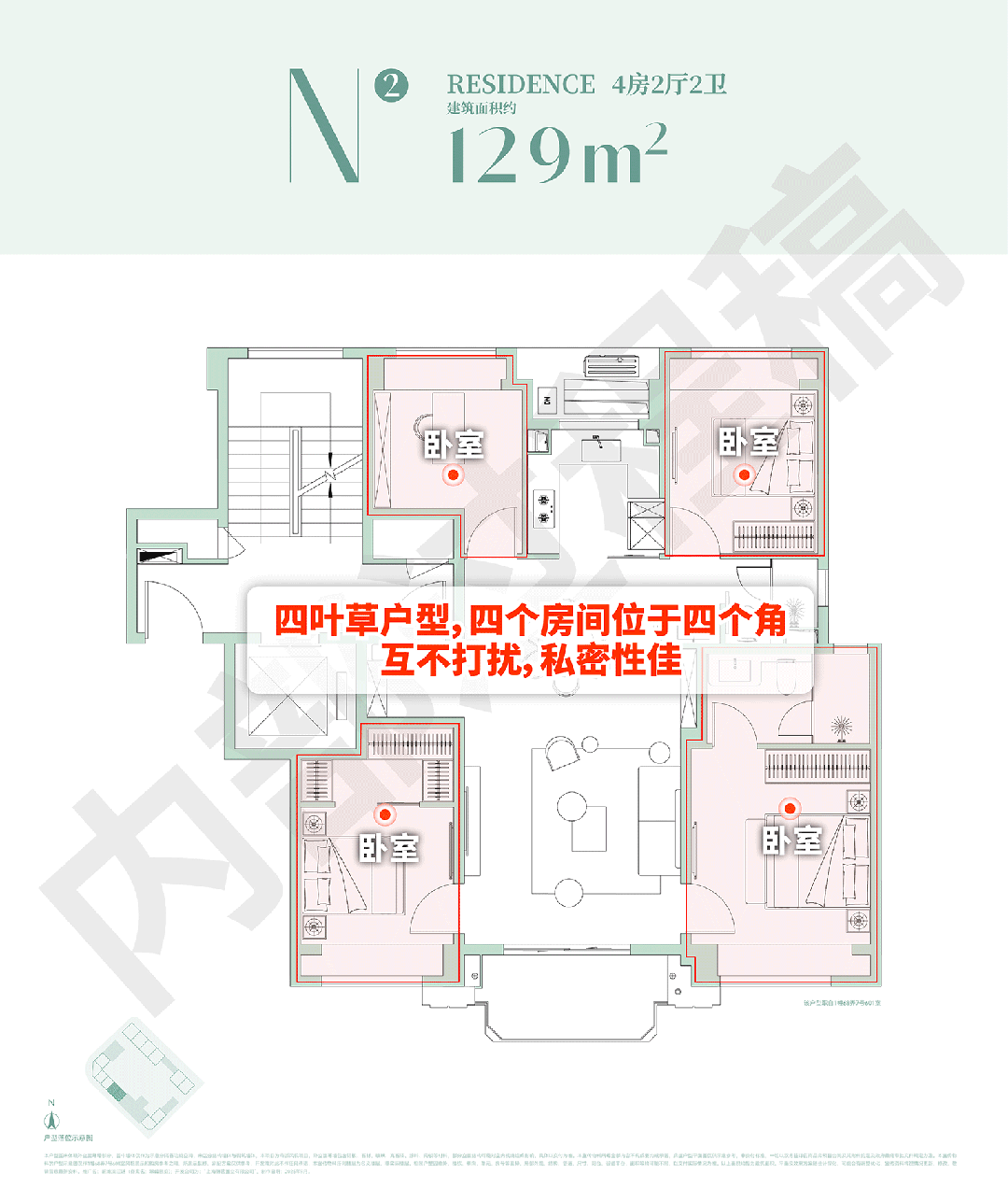 市面上多数4房户型常出现3-4个房间扎堆的问题,次卫的洗漱声、交谈声轻易传遍相邻房间,私密性与居住静谧感打折扣。