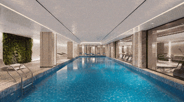 地下车库电梯厅,以简奢典雅的赫本金为笔触,契合江河之子美学品位;约500㎡地下会所,臻设健身空间、蔚蓝泳池,令到访者在活力元气中感受健康美好。